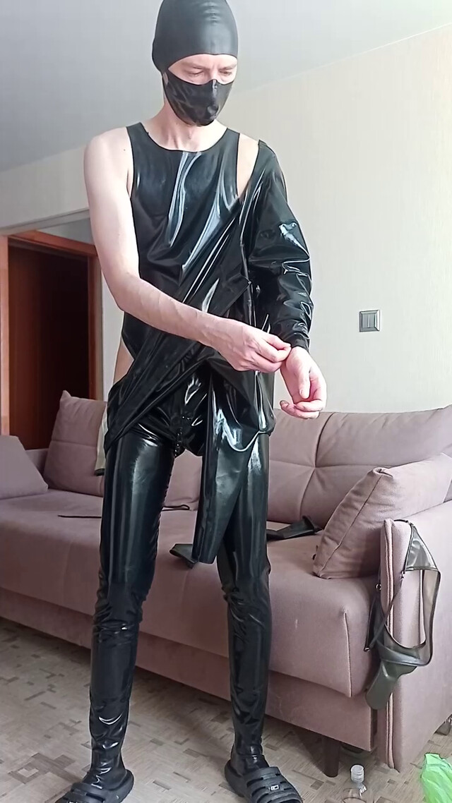 Надел черный латексный комбез и перчатки, к сожалению по размеру мал оказался и быстро порвался в итоге.